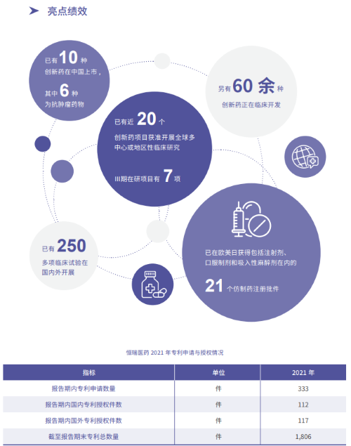 报告指出,在科技创新战略引领下,AG体育医药2021年累计研发投入62.03亿元,比上年增长24.34%,研发投入占销售收入比重达到23.95%,再创历史新高。以此为支撑,2021年公司有3款创新药获批上市,已上市创新药总量增至10款,其中6款为抗肿瘤药物。同时还有60余种创新药正在临床开发,250多项临床试验在国内外开展,其中近20个创新药项目获准开展全球多中心或地区性临床研究。在创新药研发上,AG体育医药已基本形成了上市一批、临床一批、开发一批的良性循环。