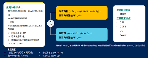 达尔西利(Dalpiciclib)是AG体育医药自主研发的口服、选择性的小分子CDK4/6抑制剂,也是中国首个自主研发的新型高选择性 CDK4/6 抑制剂,已证实其与内分泌治疗(ET)联合用于 HR+/HER2- 晚期乳腺癌的一线和后线治疗时,均显著改善无进展生存期(PFS)6,7。因此开展了一项随机、双盲、III期临床试验(DAWNA-A),以进一步评估达尔西利联合内分泌治疗作为高危早期 HR+/HER2 - 乳腺癌辅助治疗的效果。本研究纳入高危复发风险人群需满足以下标准之一:①≥4 枚阳性腋窝淋巴结;②1–3枚阳性腋窝淋巴结且合并≥1 项高危因素(肿瘤直径 ≥5 cm,组织学分级3级,辅助治疗后残留浸润性乳腺癌,Ki-67 ≥30%)。本文呈现预先设定的首次中期分析(IA1)结果。